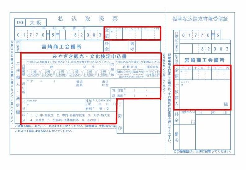 振込取扱票(兼検定申込書)に必要事項をご記入の上、郵便局にて受験料をお支払ください。
