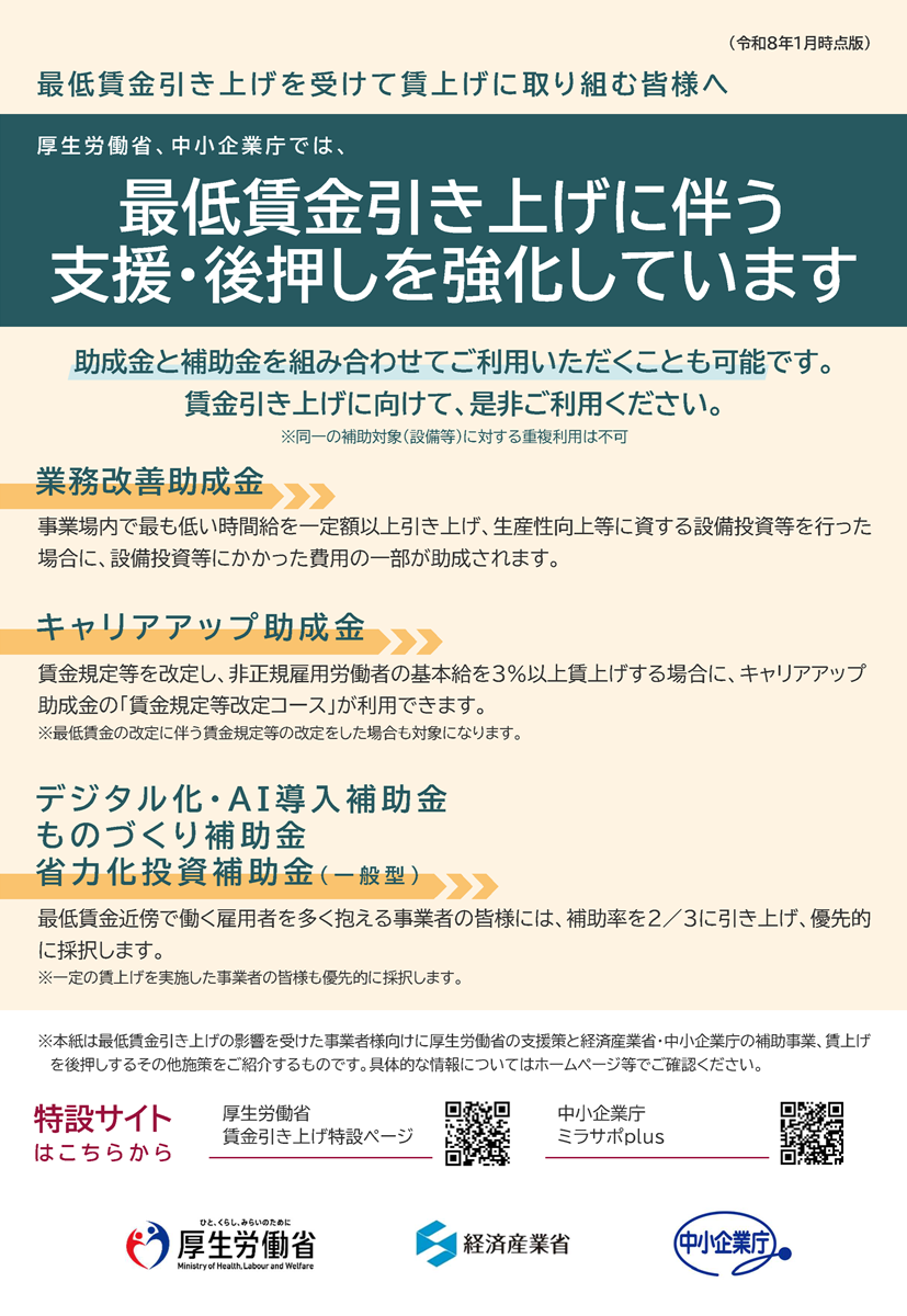 厚生労働省、中小企業庁では、最低賃金引き上げに伴う支援・後押しを強化しています。