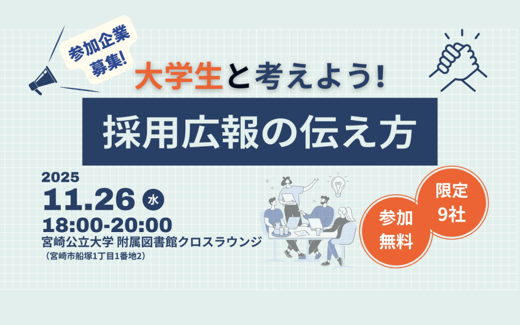 宮崎市の「令和7年度 地元企業と大学生のつながり強化支援事業」として、大学生と採用広報について一緒に考える『MEET&TALK』が開催されます。