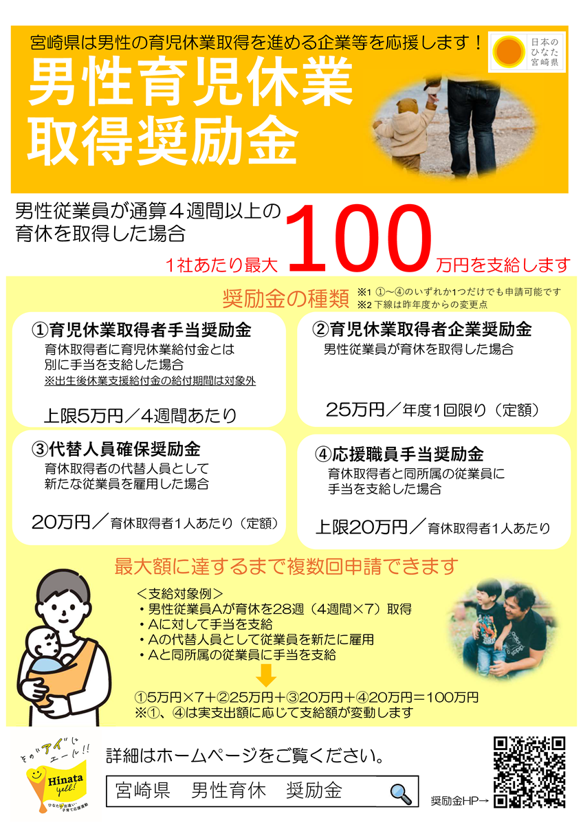 ・宮崎県ホームページ:【男性育児休業取得奨励金】男性の育休取得を進める企業等を応援します!