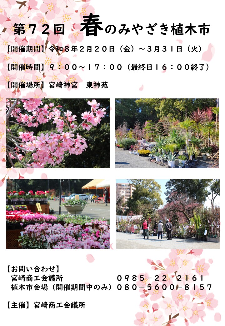 春のみやざき植木市は、皆様方のご支援により72回を迎えます。今回も、春を彩る花木等を多数展示・販売します。ご家族お揃いでお越しいただき、宮崎の春をご満喫ください。