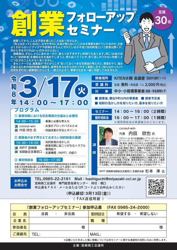 今回の講師である内田欣也診断士や、INPIT宮崎県知財総合支援窓口、よろず支援、日本政策金融公庫による無料相談会を実施します。経営についてのお困りごとやご相談があれば、せっかくの機会なのでご活用ください。相談は先着順になりますので、セミナーと併せてお申込みください。