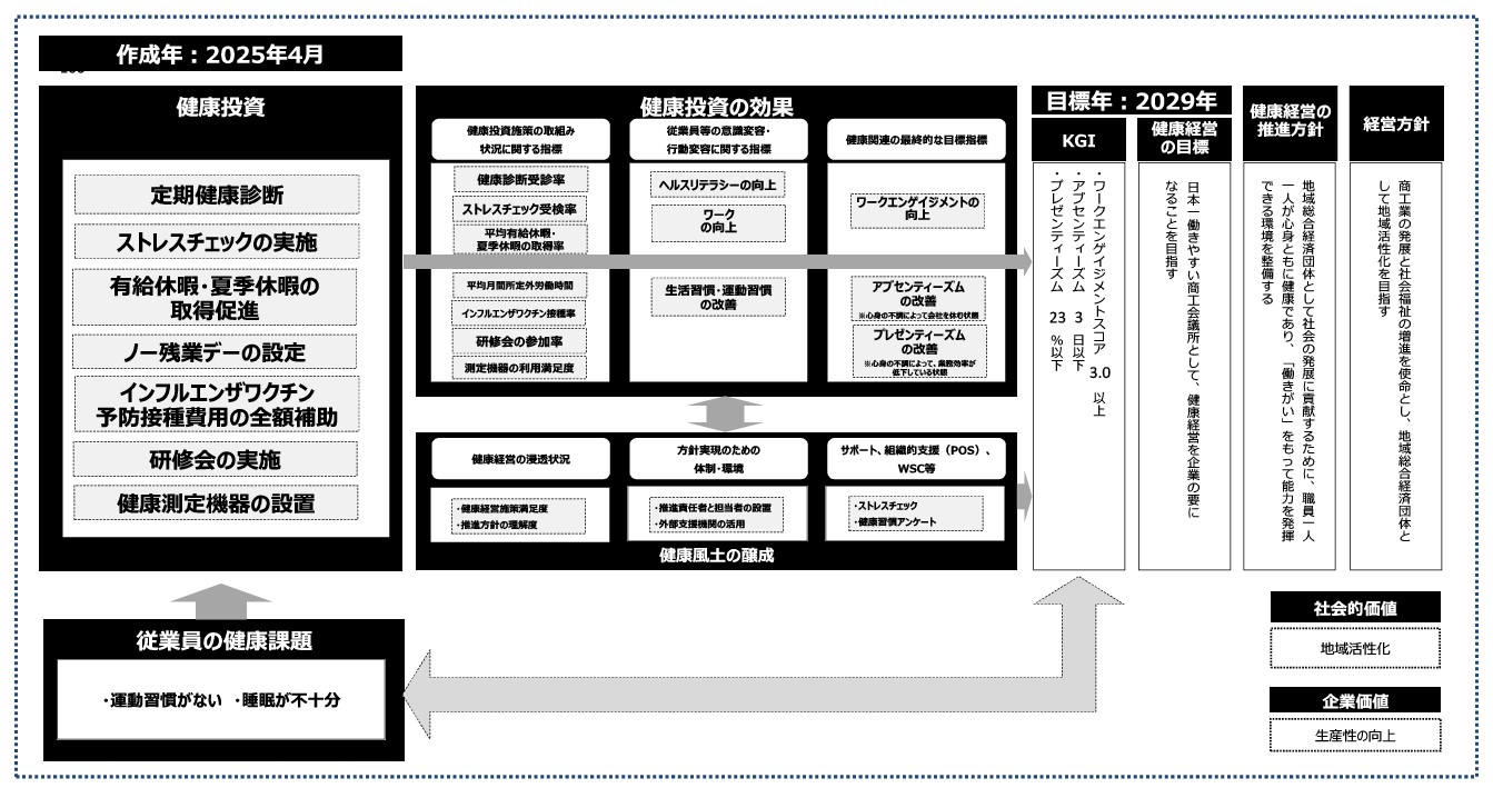 | 健康経営施策に対する投資額 | 約 307万円 | ・定期健康診断受診料 ・ストレスチェック実施費用 ・健康経営に関する研修会開催費等 ・健康保持・増進のための費用 ・会員共済加入事業所に対する健康診断料補助 等 |